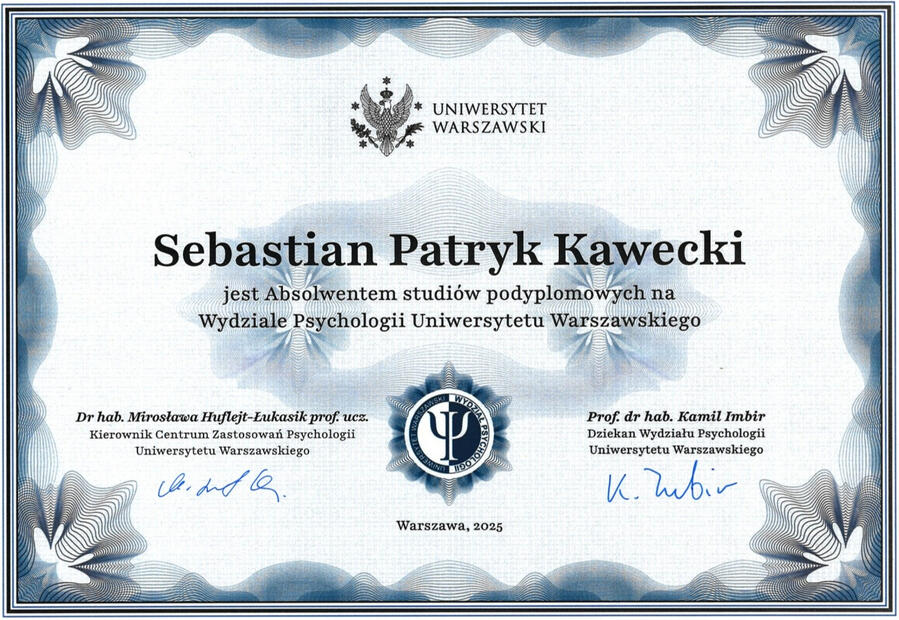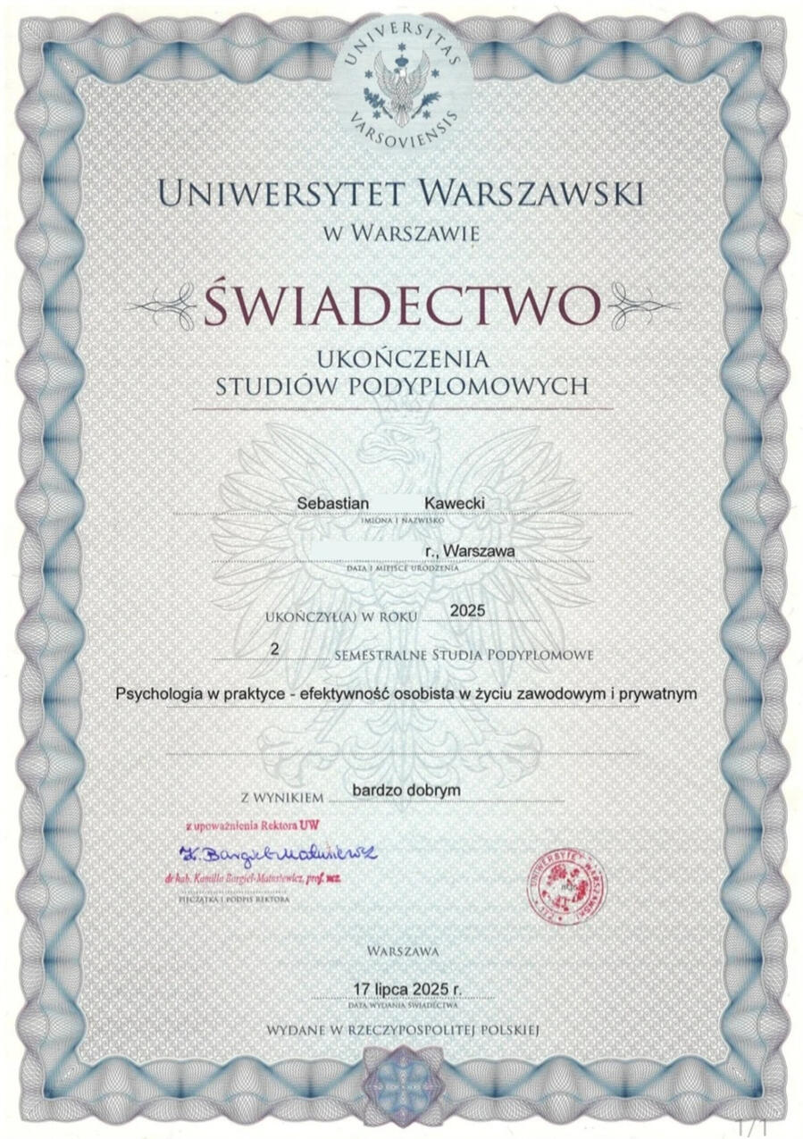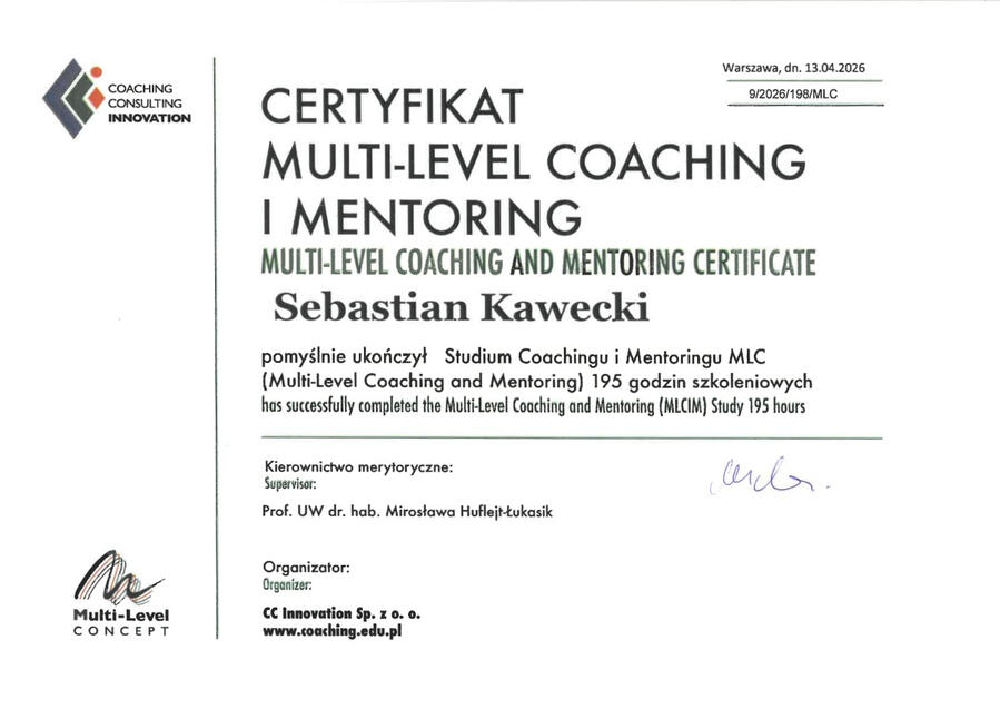 Jestem certyfikowanym coachem i mentorem MLC. Mam ponad 10-letnie doświadczenie w biznesie, które zdobywałem w różnych rolach, od pracy operacyjnej po rolę lidera zespołu, zarówno w mniejszych firmach, jak i dużych organizacjach.Ukończyłem studia podyplomowe z psychologii na Uniwersytecie Warszawskim oraz Studium Coachingu i Mentoringu MLC pod kierownictwem prof. UW dr. hab. Mirosławy Huflejt-Łukasik.Poniżej znajdziesz moje certyfikaty oraz świadectwa potwierdzające zdobyte kwalifikacje.